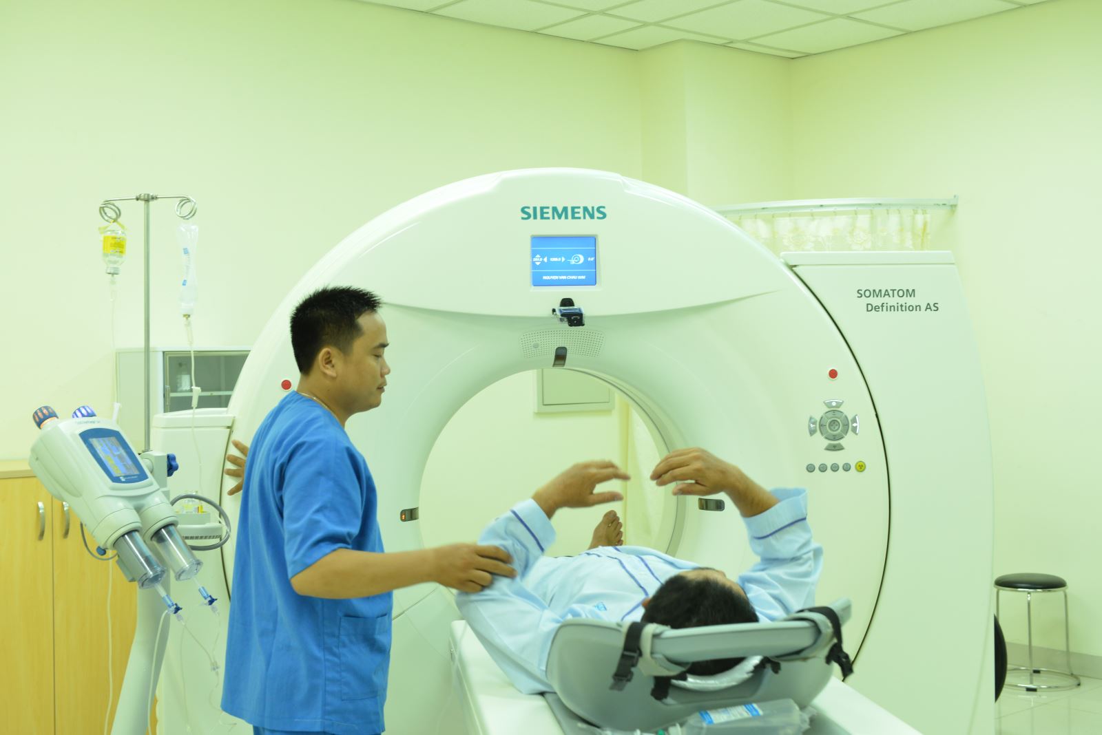 - Chụp cắt lớp vi tính (CT scanner): Các kỹ thuật thực hiện trên 6 hệ thống bao gồm ở nội viện và hợp tác. Ở nội viện có 2 hệ thống CT 64 và 128 dãy đầu thu (Definition AS và AS plus – Siemens) với các phần mềm chuyên dụng cho tim mạch, thần kinh, tiêu hóa, gan mật,… Về hợp tác, khoa có 1 hệ thống CT 2 đầu bóng 256 dãy đầu thu, 2 mức năng lượng và 3 hệ thống CT 128 dãy đầu thu.