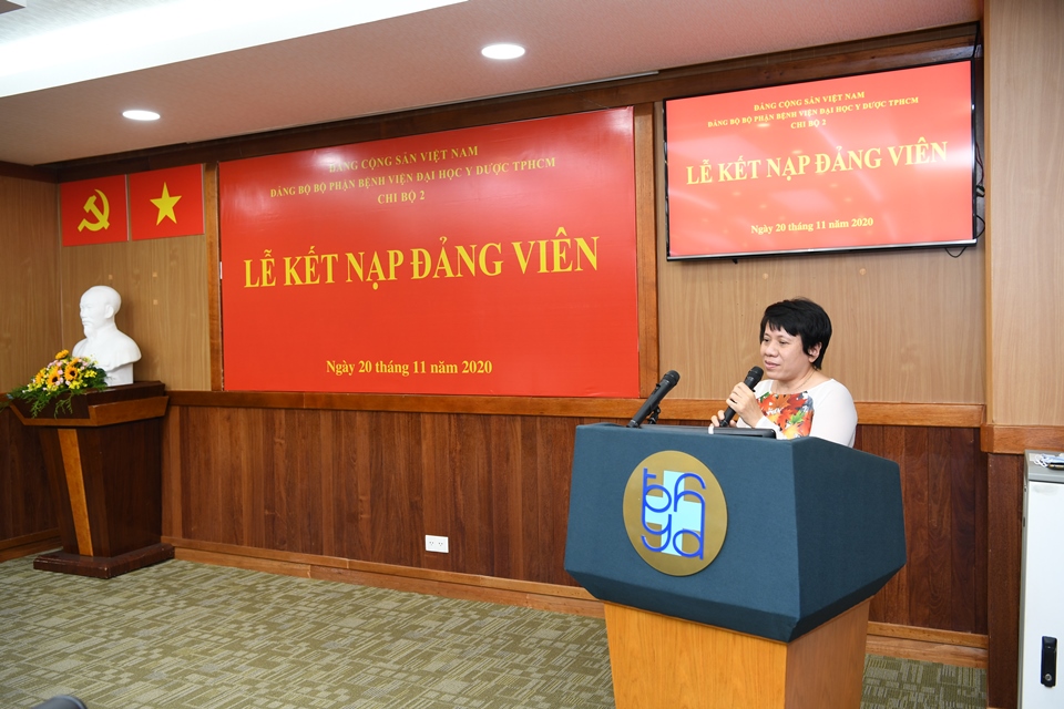 Ngày 20/11/2020, Đảng bộ bộ phận Bệnh viện Đại học Y Dược TPHCM (BV) tổ chức lễ kết nạp đảng viên cho đồng chí Lê Nguyễn Thùy Khanh, trực thuộc Chi bộ 2. Tham dự buổi lễ có đồng chí Đặng Anh Long – Phó Bí thư Đảng bộ bộ phận BV, Bí thư Chi bộ 2; đại diện cấp ủy Chi bộ 1, Chi bộ 3, Ban chấp hành Đoàn TNCS HCM BV, Tổ Công đoàn phòng Quản lý chất lượng bệnh viện và các đồng chí đảng viên Chi bộ 2.