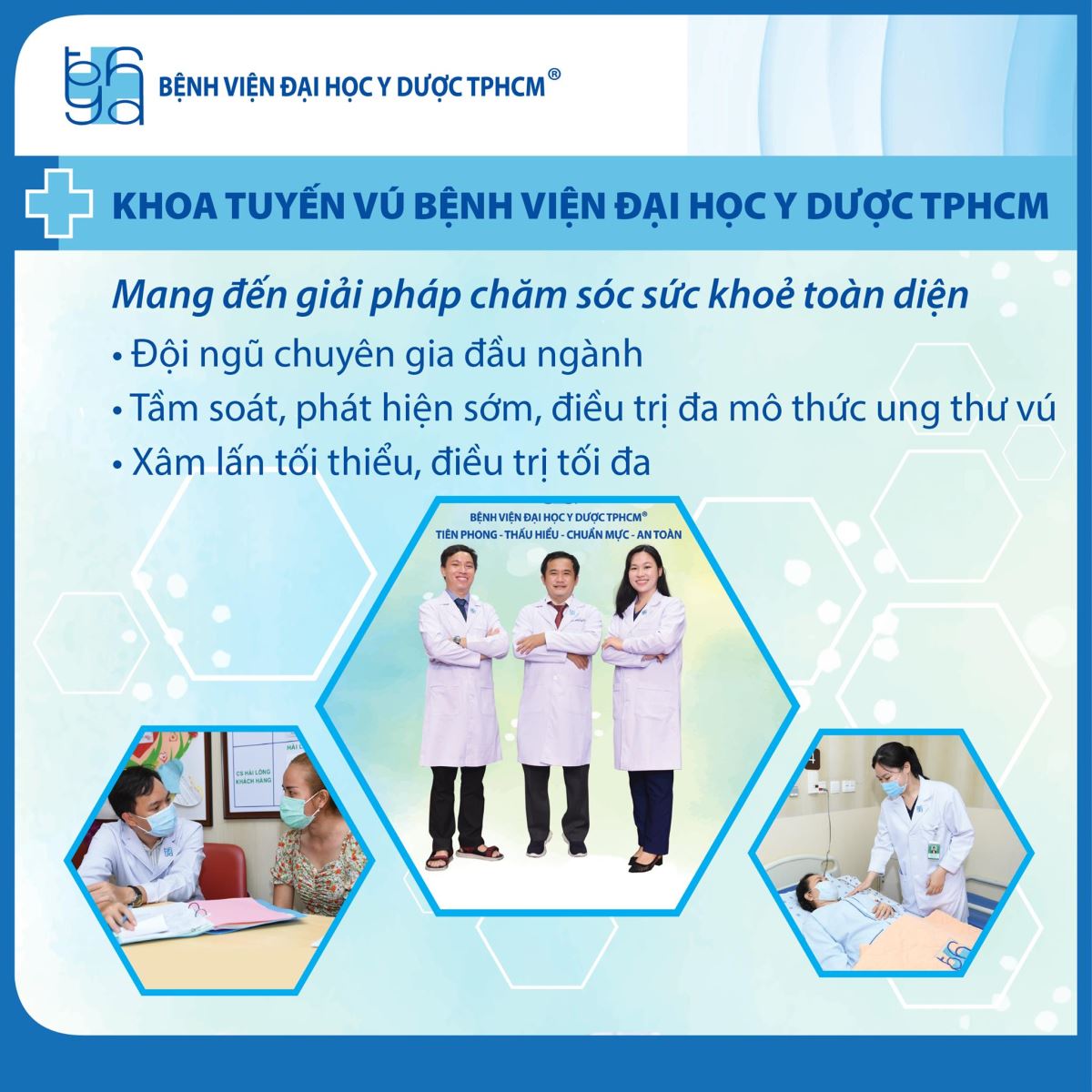 Khoa Tuyến vú Bệnh viện Đại học Y Dược TPHCM được thành lập với mục đích nâng cao chất lượng, phát triển các dịch vụ kỹ thuật chuyên sâu liên quan đến tầm soát, chẩn đoán và điều trị các bệnh lý tuyến vú đặc biệt là ung thư vú. Với tinh thần tận tâm, yêu nghề, lấy người bệnh làm trung tâm, đội ngũ y bác sỹ của Khoa Tuyến vú luôn mang đến cho người bệnh sự hài lòng, niềm tin trong quá trình khám và điều trị. Ngoài ra, hướng tới việc nâng cao ý thức bảo vệ sức khỏe cho người dân, Khoa tích cực đẩy mạnh việc tuyên truyền đi tầm soát sớm và giảm thiểu các trường hợp nhập viện muộn.
