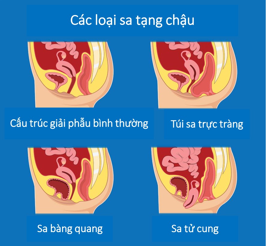 - Phân loại: Sa tạng chậu bao gồm: sa khoang trước âm đạo (sa niệu đạo, sa bàng quang), sa khoang giữa âm đạo (sa tử cung, sa mỏm cắt âm đạo – nếu đã cắt tử cung), sa thành sau âm đạo (sa trực tràng kiểu túi). Sa tạng chậu có thể riêng lẻ hay kết hợp giữa sa các khoang