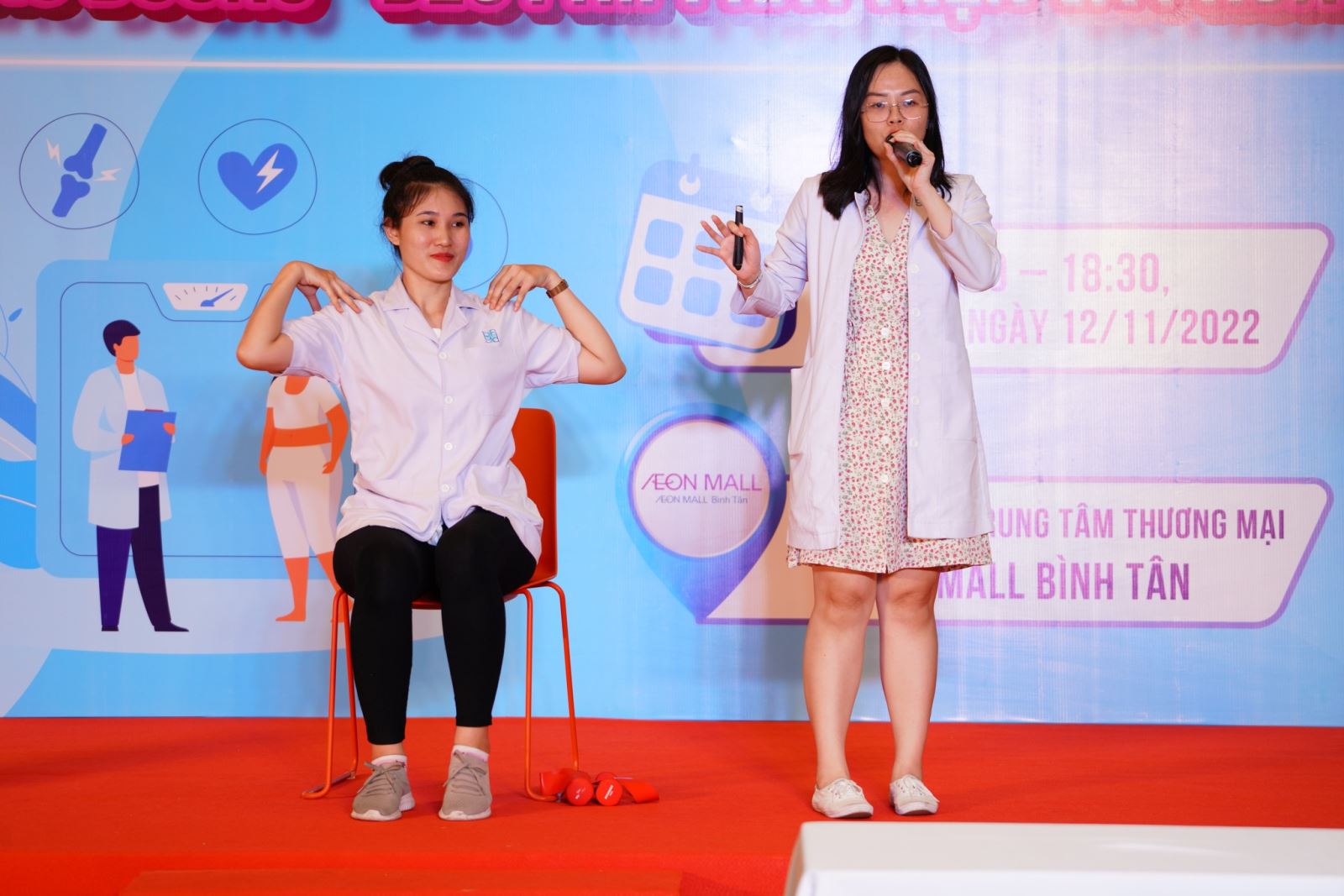 Kết thúc phần Tọa đàm, người tham dự chương trình được tư vấn sức khỏe trực tiếp cùng các Bác sĩ. Những trường hợp cần được chẩn đoán xác định đã được nhận phiếu khám miễn phí chuyên khoa Nội tiết tại BV ĐHYD TPHCM. Chương trình còn diễn ra vô cùng sôi nổi với phần đố vui, nhận quà và các bài tập nâng cao sức khỏe, phòng tránh bệnh béo phì với sự hướng dẫn của BS CKI. Bùi Thị Minh Phượng và kỹ thuật viên Vũ Trần Thiên Thanh – Khoa Phục hồi chức năng BV ĐHYD TPHCM.