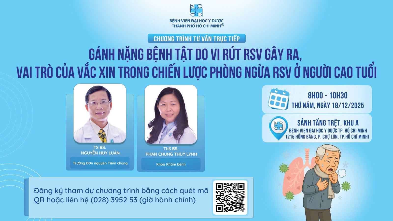 Bệnh viện Đại học Y Dược TP. Hồ Chí Minh tổ chức chương trình tư vấn trực tiếp chủ đề “Gánh nặng bệnh tật do vi rút RSV gây ra, vai trò của vắc xin trong chiến lược phòng ngừa RSV ở người cao tuổi” nhằm nâng cao nhận thức cộng đồng về tác động của RSV đối với người cao tuổi và phương pháp phòng ngừa các bệnh lí hô hấp.