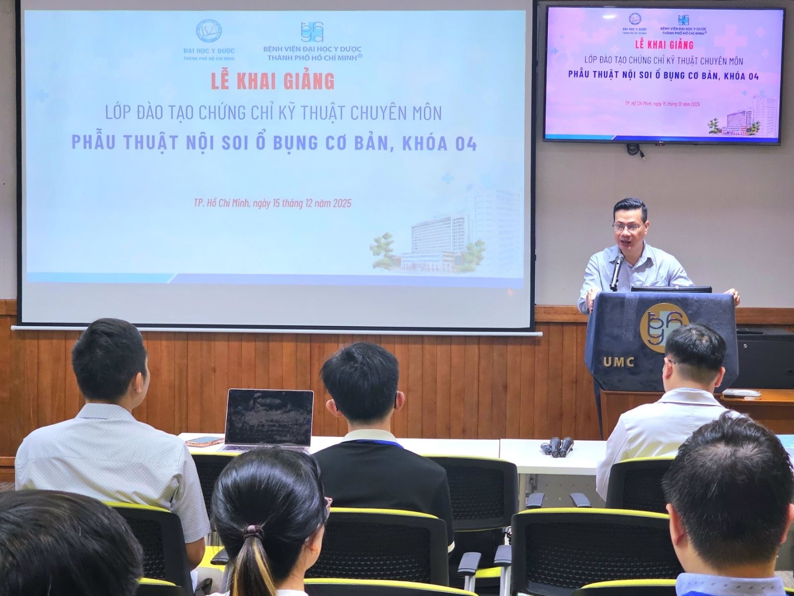 Ngày 15/12/2025, tại Bệnh viện Đại học Y Dược Thành phố Hồ Chí Minh, Trung tâm huấn luyện phẫu thuật nội soi - Bệnh viện Đại học Y Dược Thành phố Hồ Chí Minh phối hợp cùng Trung tâm Đào tạo nhân lực y tế theo nhu cầu xã hội – Đại học Y Dược Thành phố Hồ Chí Minh đã tổ chức Lễ khai giảng Chương trình đào tạo chứng chỉ kỹ thuật chuyên môn Phẫu thuật nội soi ổ bụng cơ bản, Khóa 4.