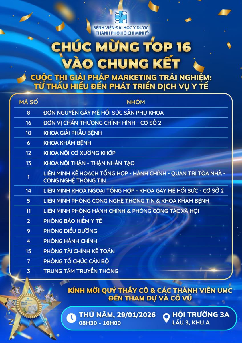 Bệnh viện Đại học Y Dược TP. Hồ Chí Minh trân trọng chúc mừng 16 Nhóm dự thi xuất sắc đã được Hội đồng Giám khảo lựa chọn và chính thức bước vào Vòng Chung kết Cuộc thi Giải pháp Marketing Trải nghiệm: “Từ thấu hiểu đến phát triển dịch vụ y tế”.