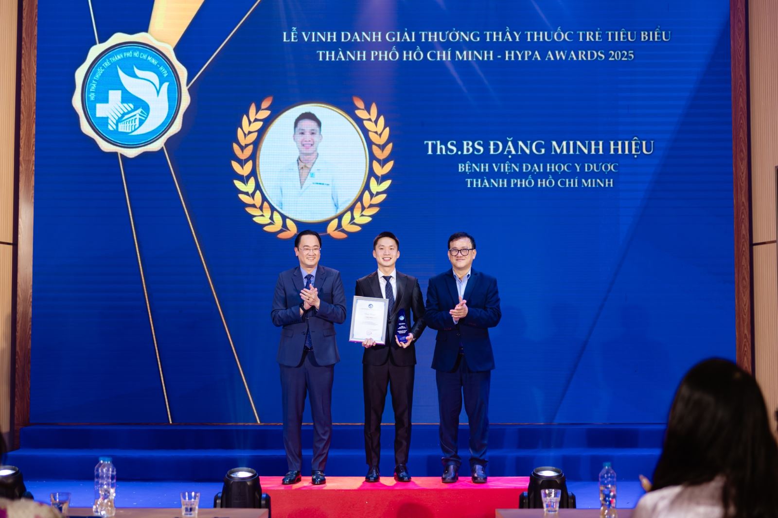 Tại buổi lễ, ThS BS. Đặng Minh Hiệu, công tác tại Khoa Gây mê Hồi sức, Bệnh viện Đại học Y Dược TP. Hồ Chí Minh (BV ĐHYD), vinh dự là một trong 36 thầy thuốc trẻ tiêu biểu được trao Giải thưởng HYPA Awards 2025. Danh hiệu này ghi nhận quá trình nỗ lực bền bỉ trong thực hành chuyên môn, tinh thần trách nhiệm trong chăm sóc người bệnh và thái độ nghiêm túc, chuẩn mực trong hành nghề y của bác sĩ trẻ đang công tác tại Bệnh viện.