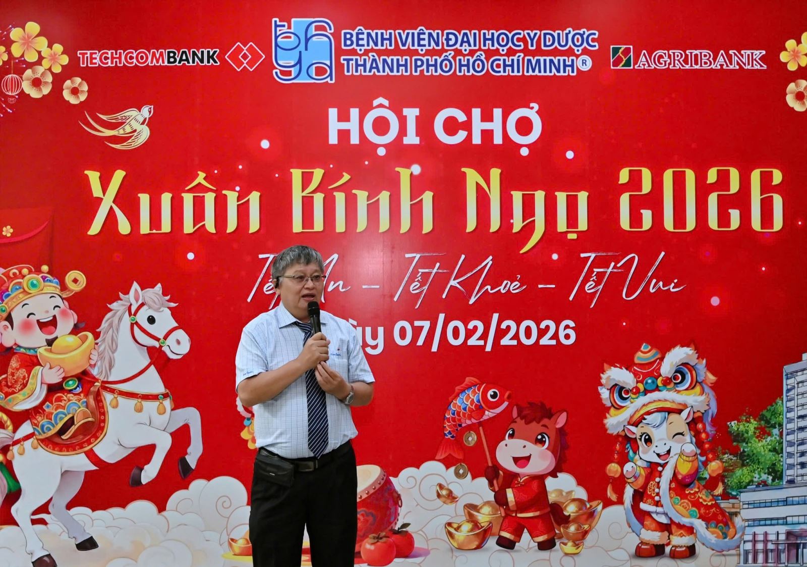 Chia sẻ từ PGS TS. Huỳnh Nghĩa – Chủ tịch Công đoàn Đại học Y Dược TP. Hồ Chí Minh, năm cũ đang dần khép lại, năm mới đang đến gần với nhiều cơ hội song hành cùng không ít thách thức, trong đó BV ĐHYD tiếp tục giữ vai trò là chỗ dựa tin cậy, là điểm tựa mang lại niềm hy vọng cho người dân Thành phố Hồ Chí Minh và các tỉnh, thành lân cận thông qua việc không ngừng nâng cao chất lượng chăm sóc và bảo vệ sức khỏe cộng đồng. Nhân dịp năm mới, ông cũng gửi lời chúc sức khỏe, an khang, thịnh vượng đến Ban Giám đốc cùng toàn thể viên chức, người lao động Bệnh viện, đồng thời bày tỏ kỳ vọng Hội chợ Xuân Bính Ngọ 2026 sẽ tiếp tục là hoạt động ý nghĩa, góp phần lan tỏa tinh thần gắn kết, sẻ chia trong đại gia đình Bệnh viện.