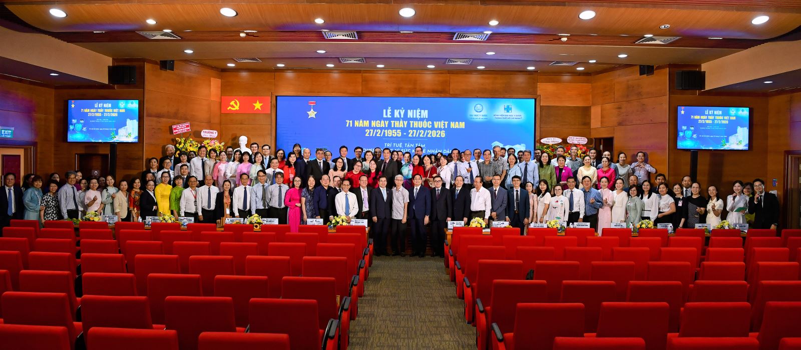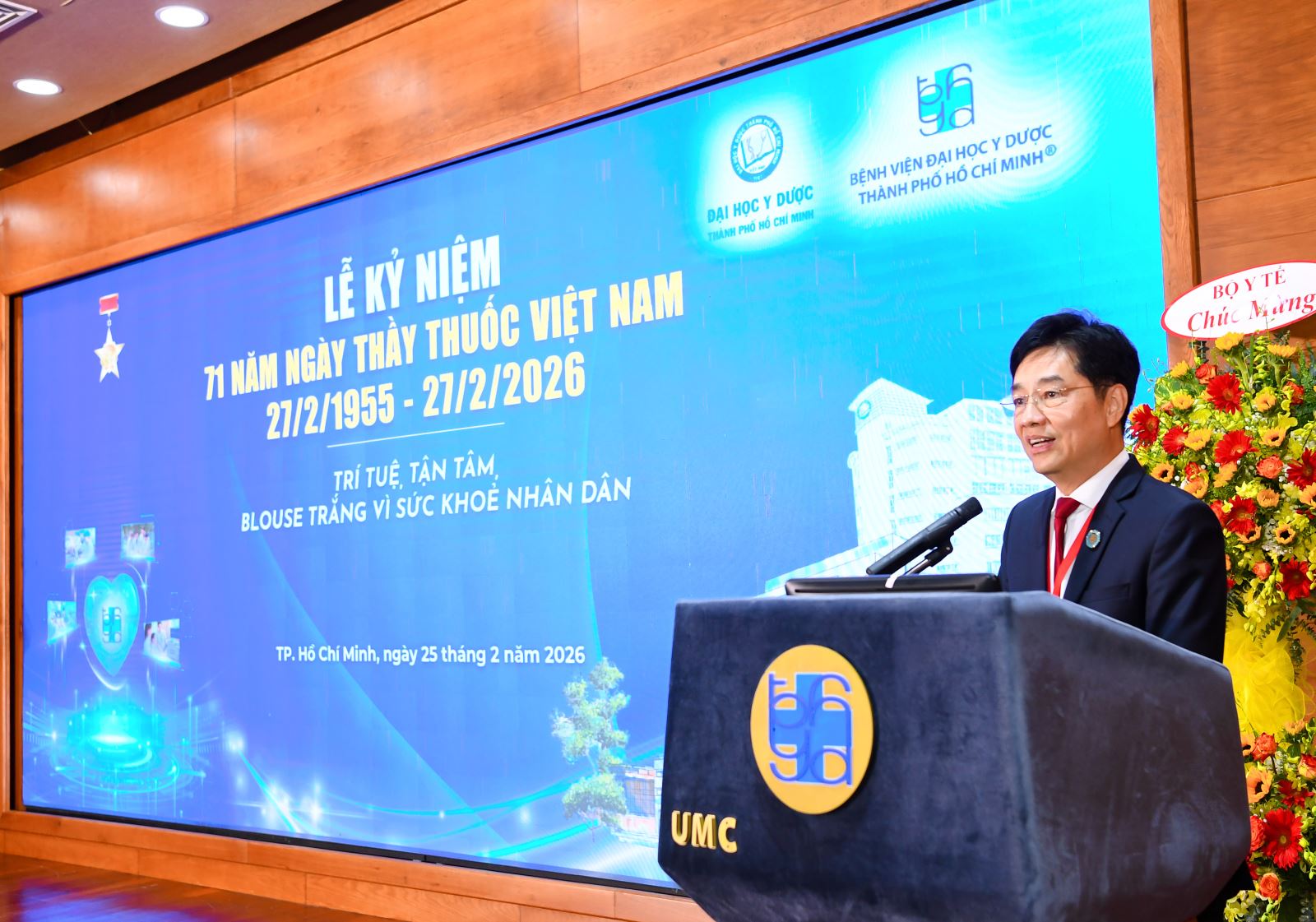 Ngày 25/02/2026, Đại học Y Dược Thành phố Hồ Chí Minh và Bệnh viện Đại học Y Dược Thành phố Hồ Chí Minh (BV ĐHYD – UMC) đã long trọng tổ chức lễ kỷ niệm 71 năm Ngày Thầy thuốc Việt Nam với chủ đề “Trí tuệ, Tận tâm, Blouse trắng vì sức khỏe nhân dân”. Chủ đề năm nay thể hiện định hướng phát triển của Nhà trường và Bệnh viện trong giai đoạn mới, tập trung đẩy mạnh ứng dụng khoa học - công nghệ, nâng cao chất lượng khám chữa bệnh, đổi mới công tác đào tạo và quản trị, đồng thời phát huy Y đức, tinh thần trách nhiệm và bản lĩnh nghề nghiệp của đội ngũ thầy thuốc.