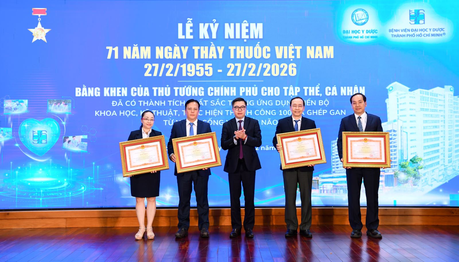 Tặng Bằng khen của Thủ tướng Chính phủ cho 01 tập thể và 03 cá nhân thuộc Bệnh viện Đại học Y Dược Thành phố Hồ Chí Minh vì đã có thành tích xuất sắc trong ứng dụng tiến bộ khoa học, kỹ thuật thực hiện thành công 100 ca ghép gan từ người sống và chết não.