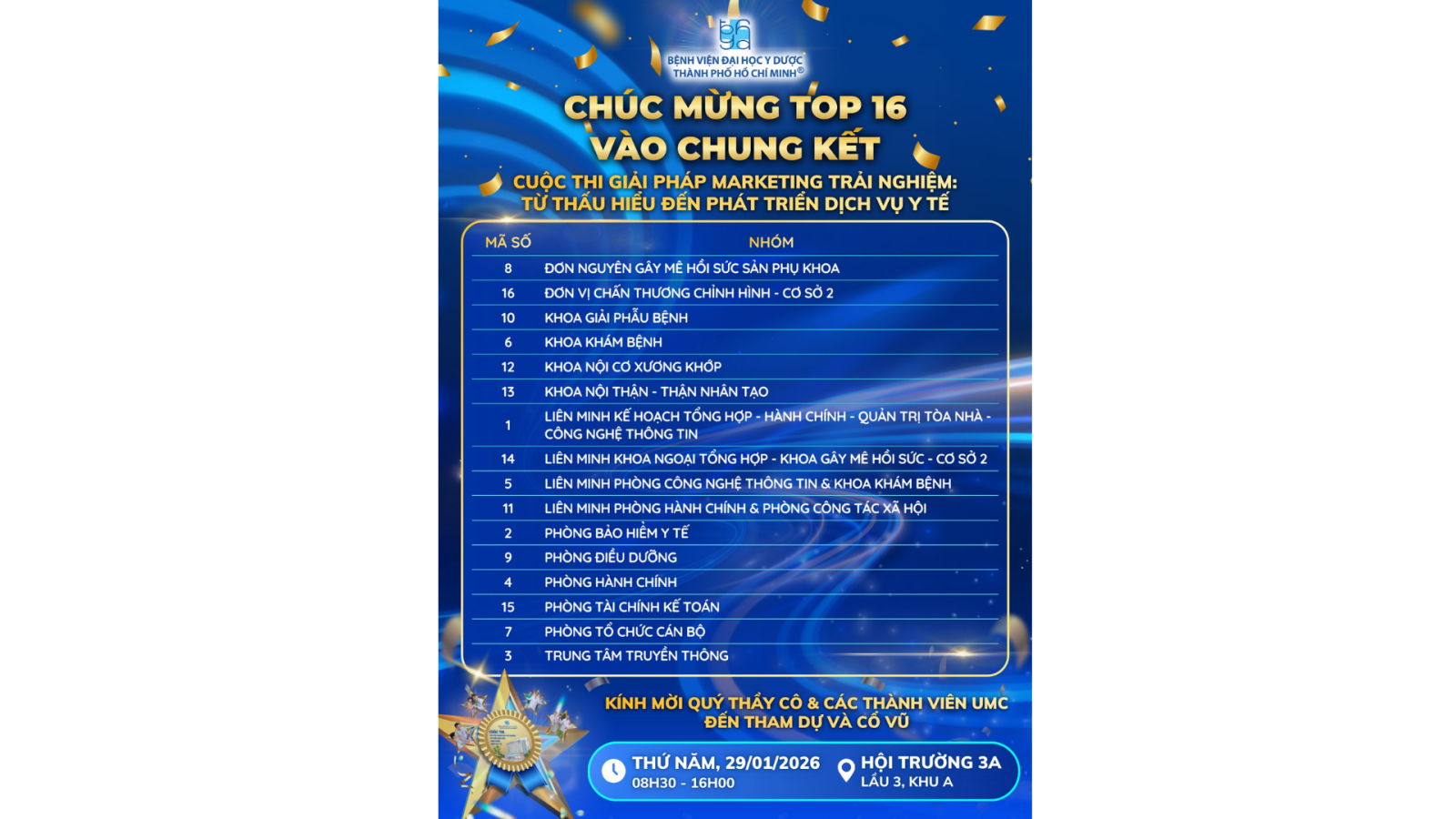 Bệnh viện Đại học Y Dược TP. Hồ Chí Minh trân trọng chúc mừng 16 Nhóm dự thi xuất sắc đã được Hội đồng Giám khảo lựa chọn và chính thức bước vào Vòng Chung kết Cuộc thi Giải pháp Marketing Trải nghiệm: “Từ thấu hiểu đến phát triển dịch vụ y tế”.