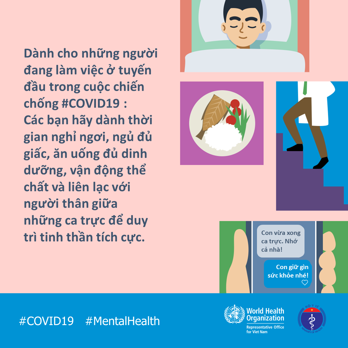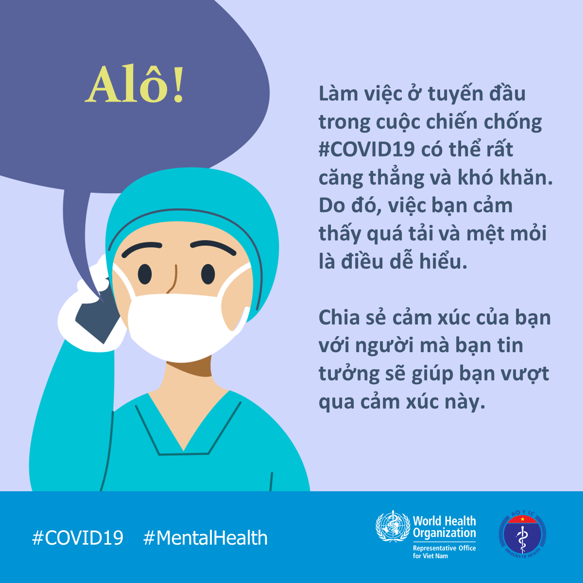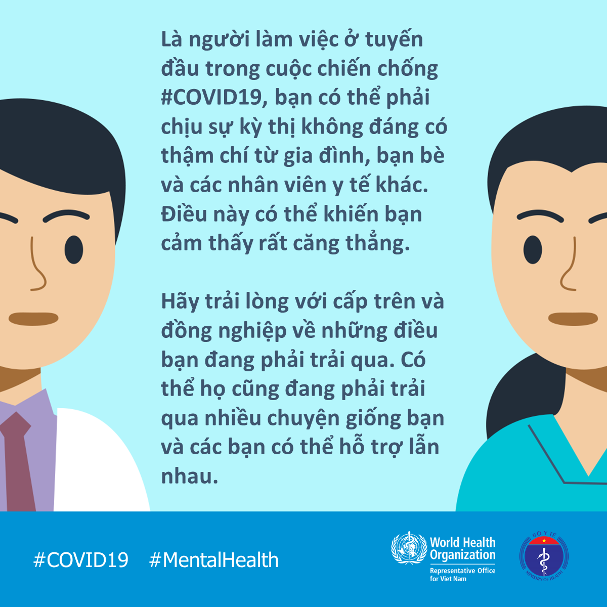 Nói về những nhân viên y tế, WHO cho biết: Nếu bạn đang làm việc ở tuyến đầu trong cuộc chiến chống COVID19, hãy biết rằng bạn không đơn độc. Hãy trải lòng về những cảm xúc của bạn với người mà bạn tin tưởng. Để duy trì tinh thần lạc quan, bạn cần được nghỉ ngơi, tập thể dục, ăn uống đủ chất, và duy trì kết nối với người thân giữa các ca trực.