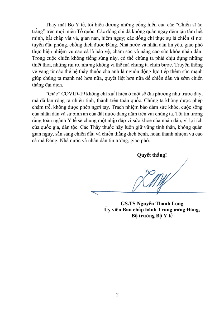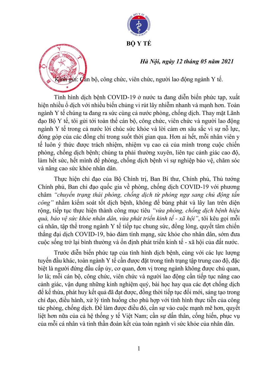 Trước tình hình dịch bệnh COVID-19 ở nước ta đang diễn biến phức tạp, xuất hiện nhiều ổ dịch với nhiều biến chủng vi rút lây nhiễm nhanh và mạnh hơn; toàn ngành Y tế đang ra sức cùng cả nước phòng, chống dịch. GS TS. Nguyễn Thanh Long - Ủy viên Ban Chấp hành Trung ương Đảng, Bộ trưởng Bộ Y tế thay mặt Lãnh đạo Bộ Y tế gửi Lời hiệu triệu tới toàn thể cán bộ, công chức, viên chức và người lao động ngành Y tế trong cả nước cùng đoàn kết, quyết tâm chiến thắng đại dịch COVID-19.