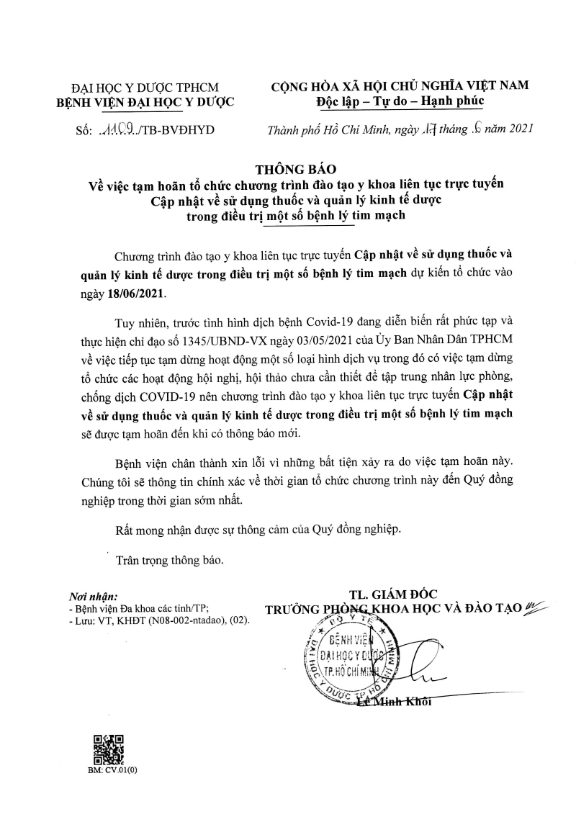 Thông báo tạm hoãn tổ chức chương trình ĐTLT trực tuyến Cập nhật về sử dụng thuốc và quản lý kinh tế dược trong điều trị một số bệnh lý tim mạch