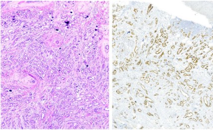 Hình 3. Nhóm lòng ống. A, Mô bệnh học của nhóm lòng ống (H&E×40). B, ER(+)- Nhân tế bào u bắt màu nâu (HMMD×40)