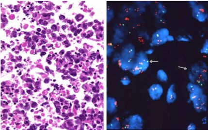Hình 4. Nhóm HER2(+).A. Mô bệnh học nhóm HER2(+). B Tế bào u khuếch đại gen sinh ung HER2 (FISHx100)