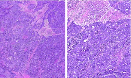 Hình 5. Nhóm giống đáy. A, Mô bệnh học nhóm giống đáy. B, hoại tử và đặc điểm mô bệnh học giống dạng đa bào
