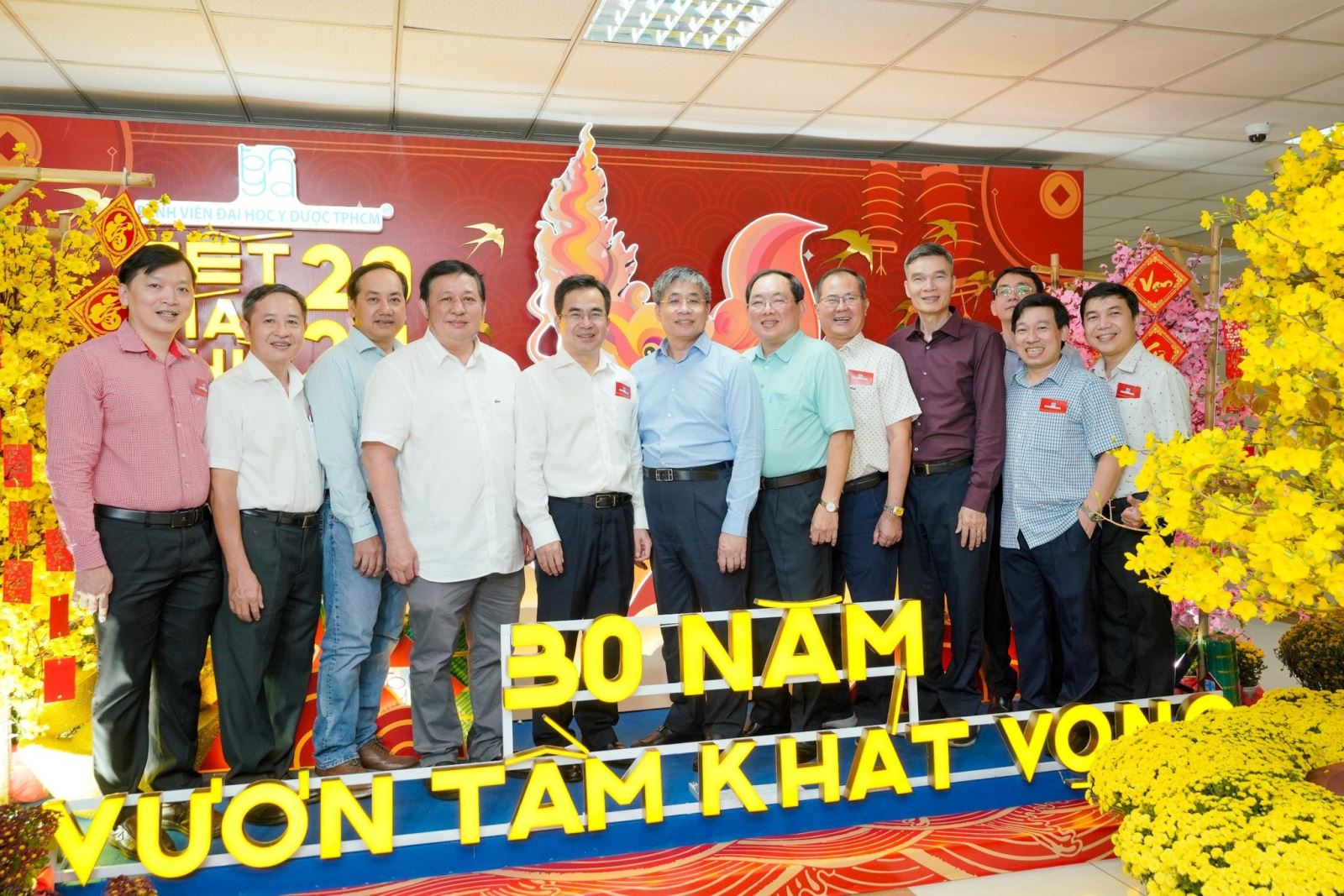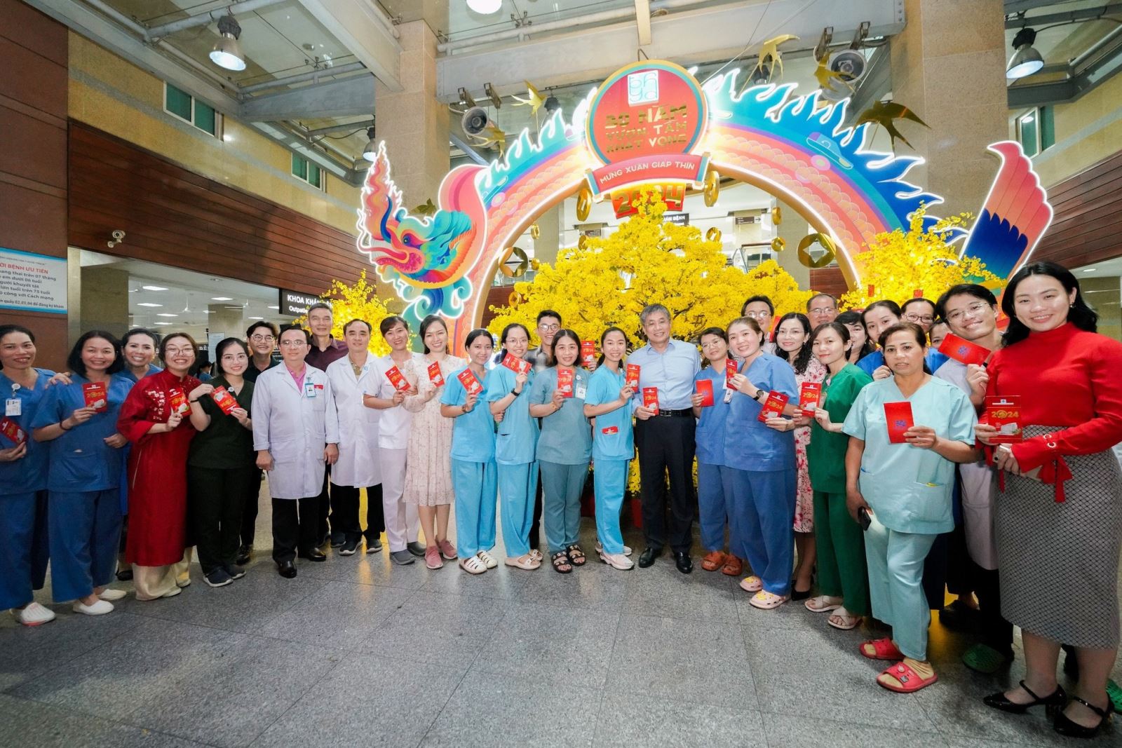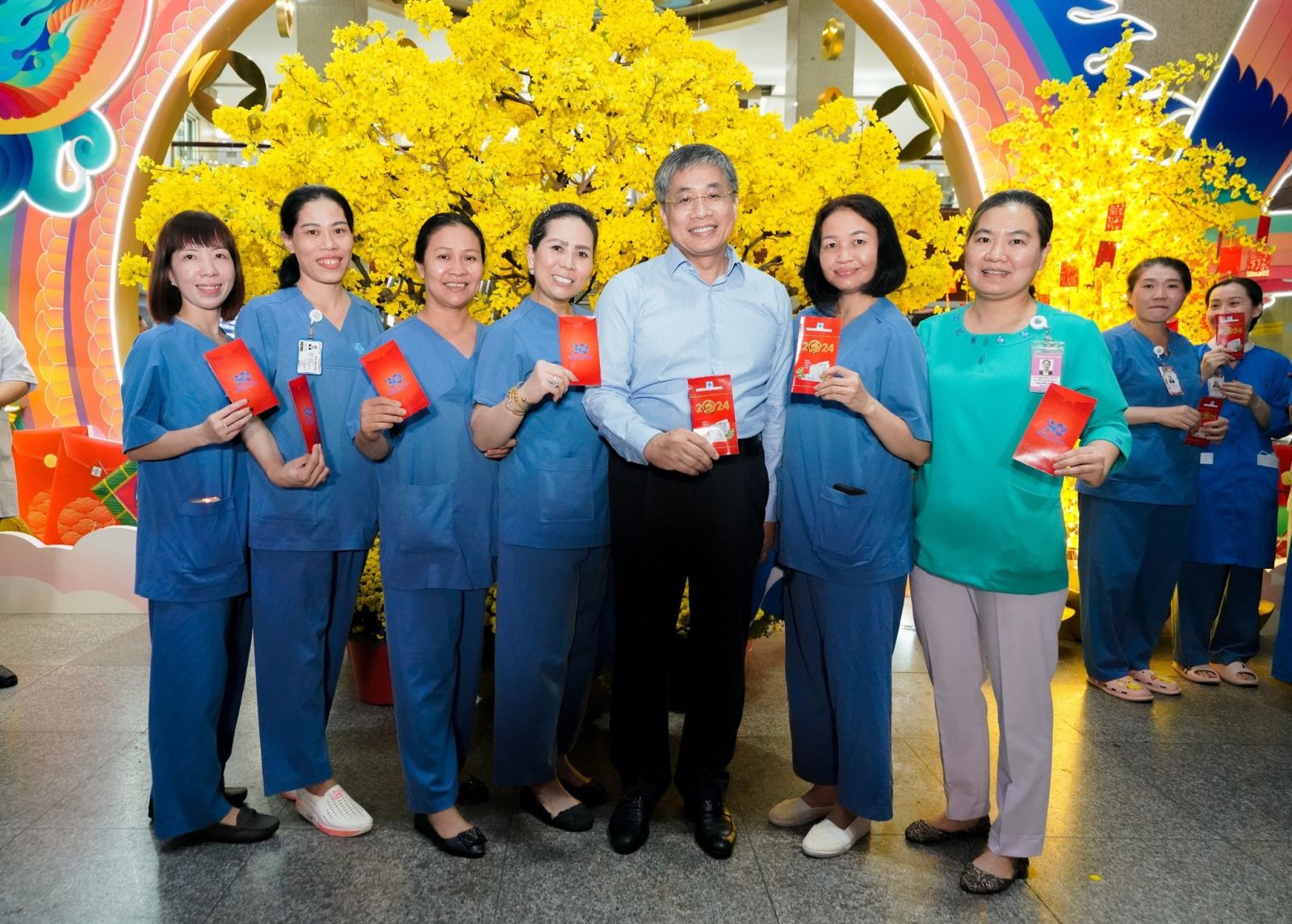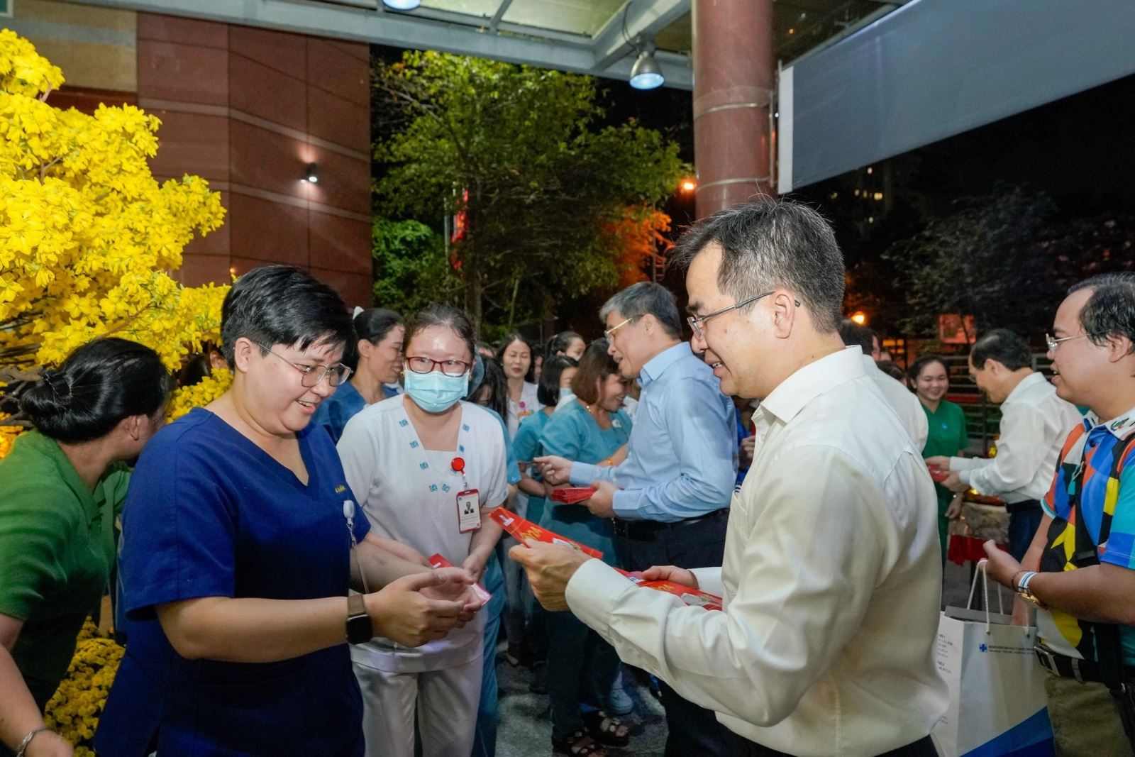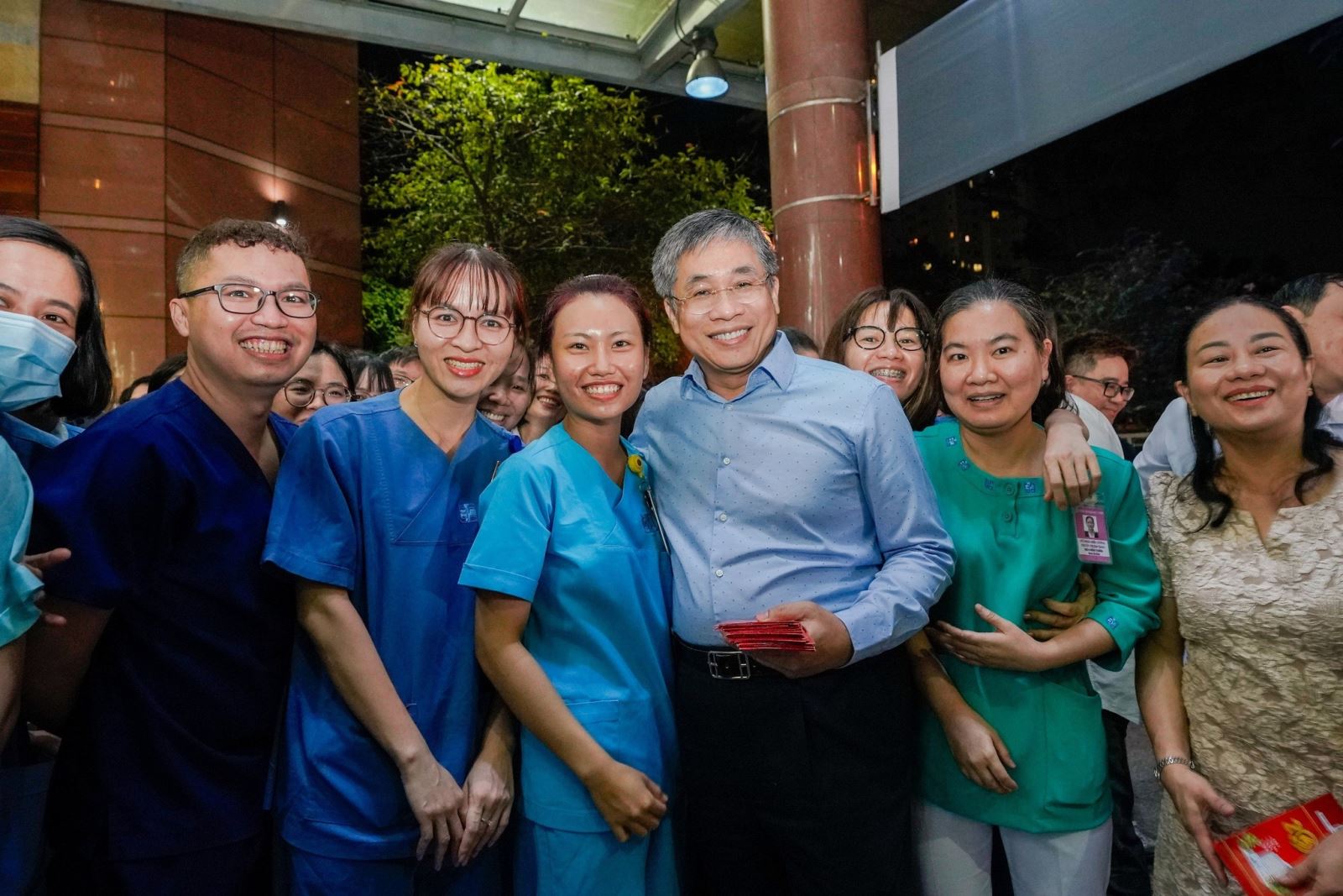 Để động viên tinh thần các thành viên tham gia trực đêm nay, PGS TS. Ngô Quốc Đạt - Phó Hiệu trưởng phụ trách Đại học Y Dược TPHCM, PGS TS BS. Nguyễn Hoàng Bắc – Giám đốc Bệnh viện đã đến chúc Tết, gửi lì xì và cùng các thành viên thưởng thức các món ăn truyền thống của Mâm cỗ giao thừa.