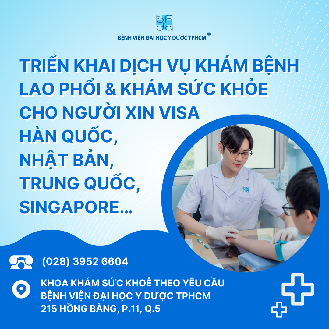 Nhằm đáp ứng nhu cầu khám và cấp giấy chứng nhận sức khỏe cho người Việt Nam xin thị thực các nước, Bệnh viện Đại học Y Dược TPHCM đã triển khai dịch vụ khám bệnh lao phổi và khám sức khoẻ cho người xin visa Hàn Quốc, Nhật Bản, Trung Quốc, Singapore…