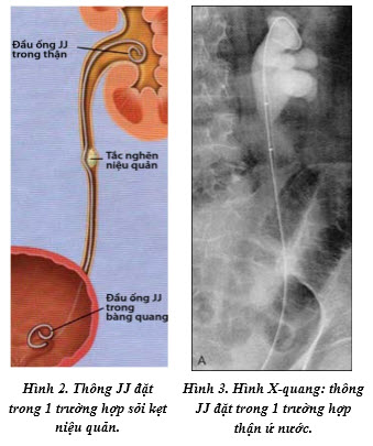 - Sau các phẫu thuật lấy sỏi, các mảnh sỏi nhỏ có thể rơi xuống làm tắc niệu quản gây đau và ứ đọng nước tiểu ở thận gây nhiễm khuẩn, lâu dài có thể làm hư hại thận. Thông JJ giúp dẫn nước tiểu từ thận xuống bàng quang, đề phòng hoặc giải quyết được tắc nghẽn của niệu quản (Hình 2, Hình 3).