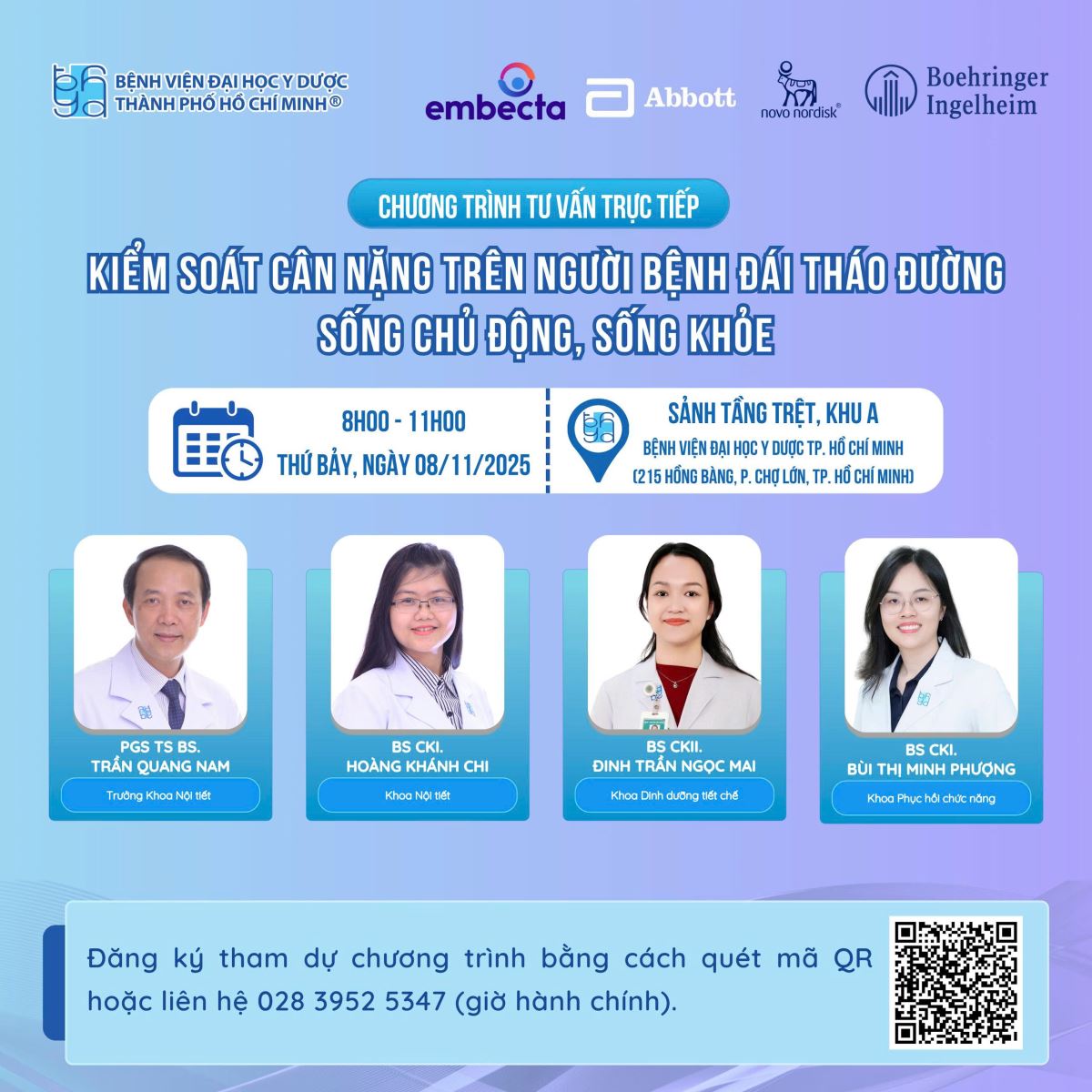 Nhân ngày Đái tháo đường Thế giới, Bệnh viện Đại học Y Dược TP. Hồ Chí Minh tổ chức chương trình tư vấn “Kiểm soát cân nặng trên người bệnh đái tháo đường - sống chủ động, sống khỏe", với sự tư vấn từ các chuyên gia: