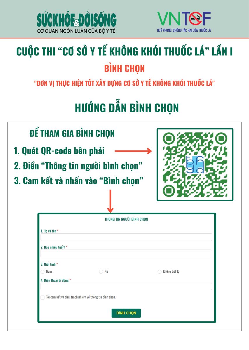 Chúng tôi trân trọng kính mời Quý vị tiếp tục dành phiếu bình chọn cho Bệnh viện trong Vòng Chung khảo của cuộc thi do Báo Sức khỏe & Đời sống, Cục Quản lý Khám, chữa bệnh, Quỹ Phòng, chống tác hại của thuốc lá và Sở Y tế phối hợp tổ chức.
