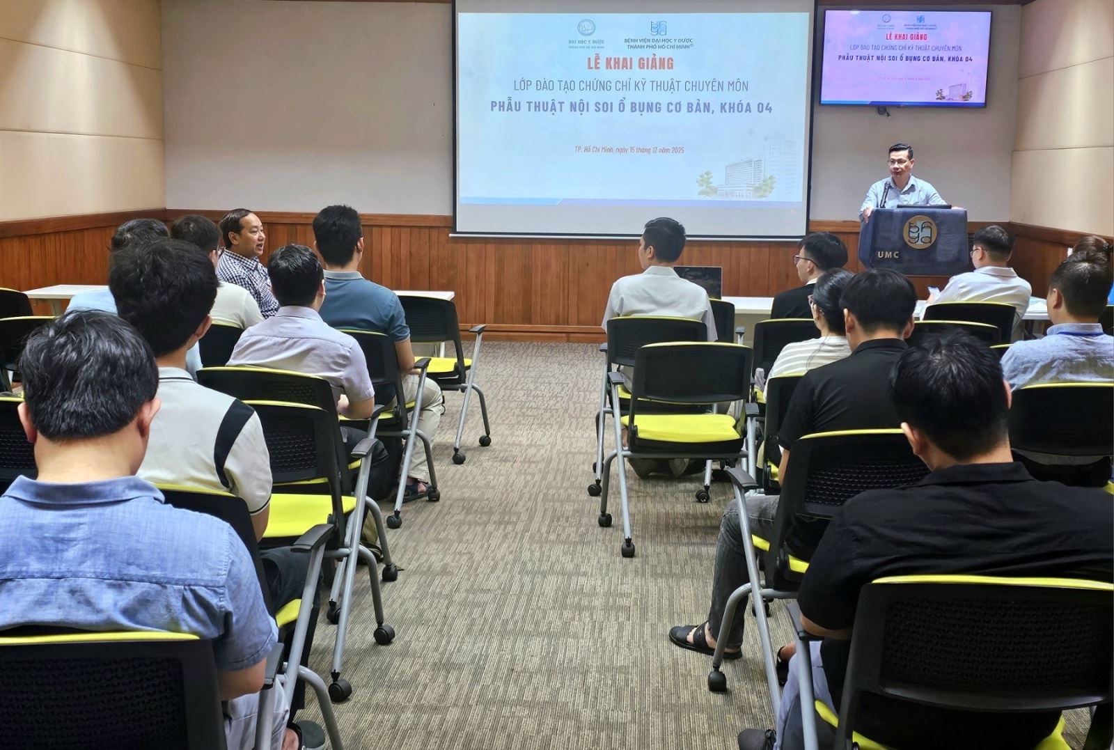 Ngày 15/12/2025, tại Bệnh viện Đại học Y Dược Thành phố Hồ Chí Minh, Trung tâm huấn luyện phẫu thuật nội soi - Bệnh viện Đại học Y Dược Thành phố Hồ Chí Minh phối hợp cùng Trung tâm Đào tạo nhân lực y tế theo nhu cầu xã hội – Đại học Y Dược Thành phố Hồ Chí Minh đã tổ chức Lễ khai giảng Chương trình đào tạo chứng chỉ kỹ thuật chuyên môn Phẫu thuật nội soi ổ bụng cơ bản, Khóa 4.