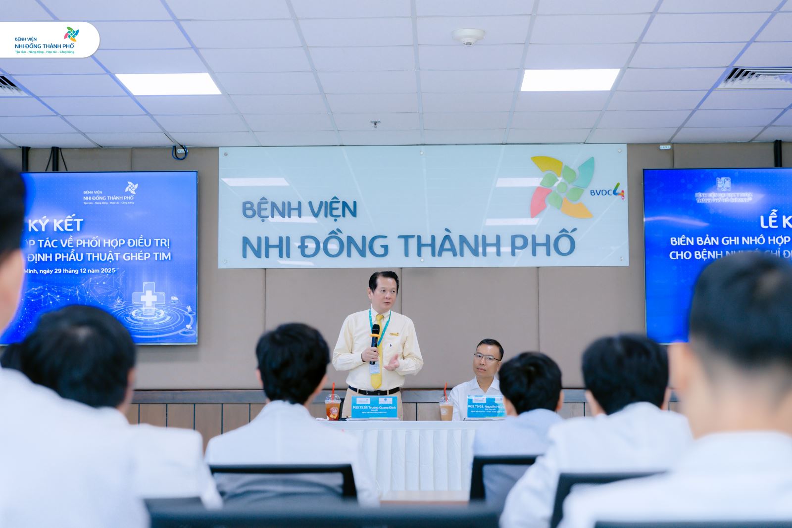 Phát biểu tại buổi lễ, PGS TS BS. Trương Quang Định - Giám đốc Bệnh viện Nhi Đồng TP. Hồ Chí Minh đánh giá cao sự phối hợp chặt chẽ, nhịp nhàng giữa hai Bệnh viện trong công tác điều trị trong thời gian qua, đặc biệt là quá trình tư vấn, hội chẩn và phối hợp triển khai các ca bệnh phức tạp. Ông cho rằng việc ký kết MOU là cơ sở quan trọng để hai đơn vị chuẩn hóa và tối ưu hóa quy trình phối hợp điều trị ghép tim cho bệnh nhi, qua đó giúp rút ngắn thời gian chuẩn bị, nâng cao hiệu quả chăm sóc và đảm bảo an toàn cho người bệnh.