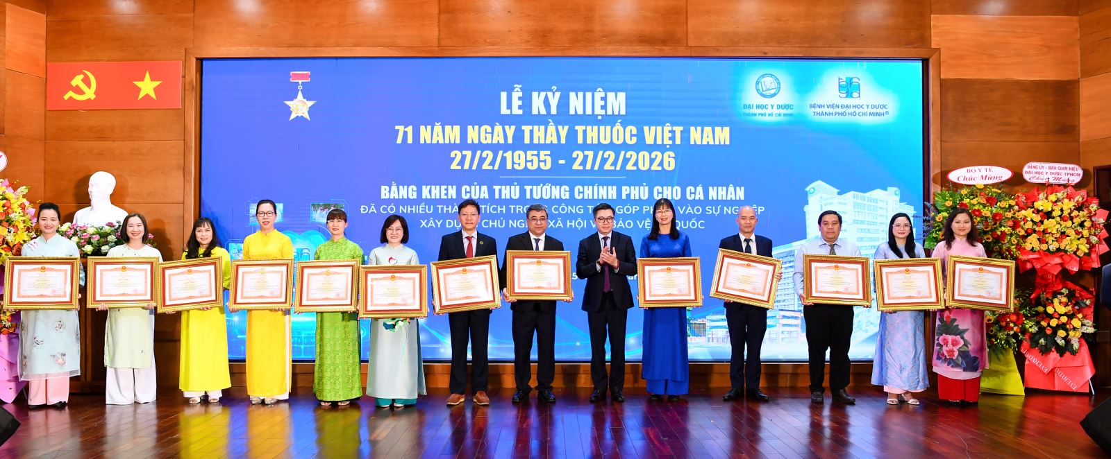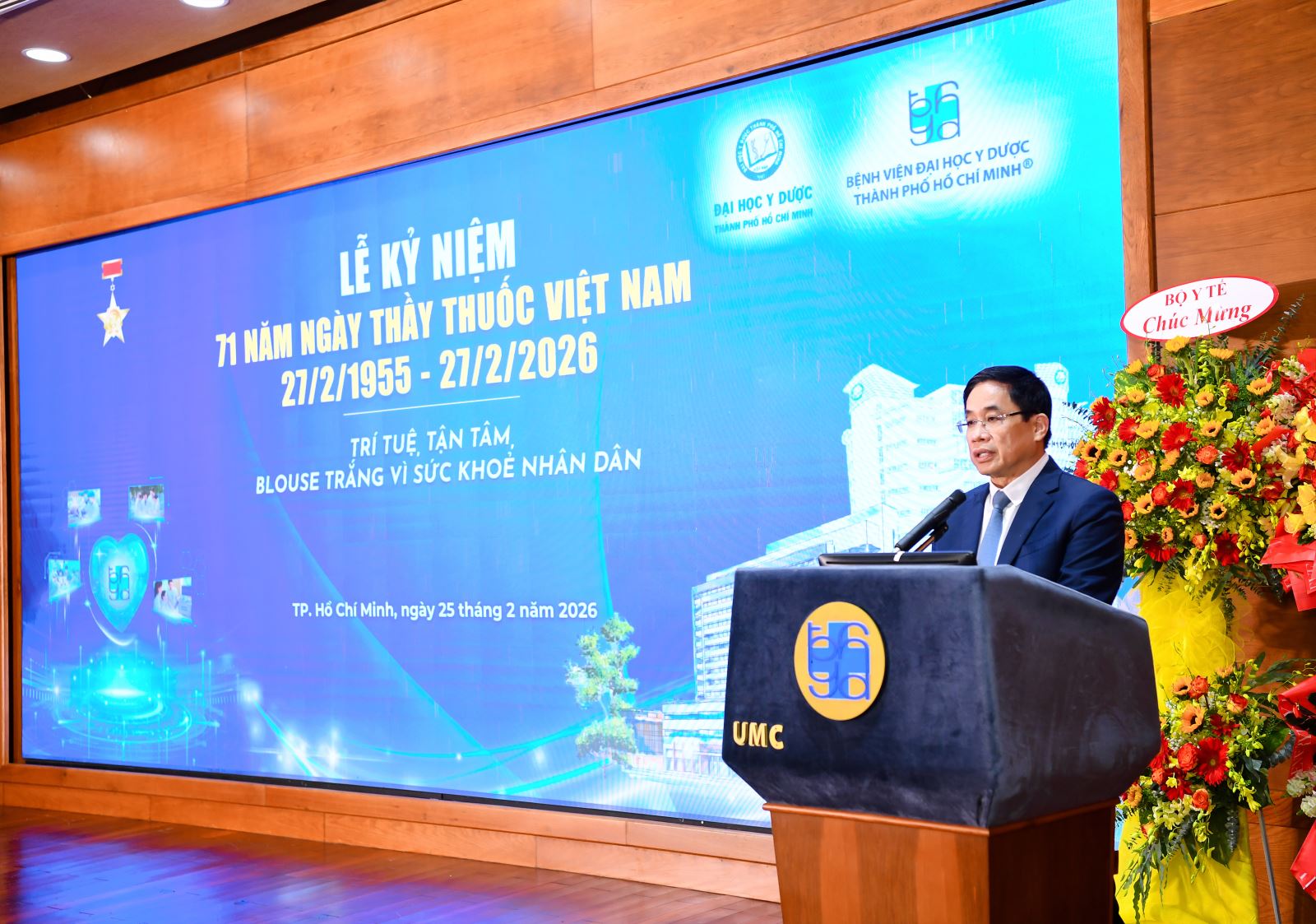 Ngày 25/02/2026, Đại học Y Dược Thành phố Hồ Chí Minh và Bệnh viện Đại học Y Dược Thành phố Hồ Chí Minh (BV ĐHYD – UMC) đã long trọng tổ chức lễ kỷ niệm 71 năm Ngày Thầy thuốc Việt Nam với chủ đề “Trí tuệ, Tận tâm, Blouse trắng vì sức khỏe nhân dân”. Chủ đề năm nay thể hiện định hướng phát triển của Nhà trường và Bệnh viện trong giai đoạn mới, tập trung đẩy mạnh ứng dụng khoa học - công nghệ, nâng cao chất lượng khám chữa bệnh, đổi mới công tác đào tạo và quản trị, đồng thời phát huy Y đức, tinh thần trách nhiệm và bản lĩnh nghề nghiệp của đội ngũ thầy thuốc.