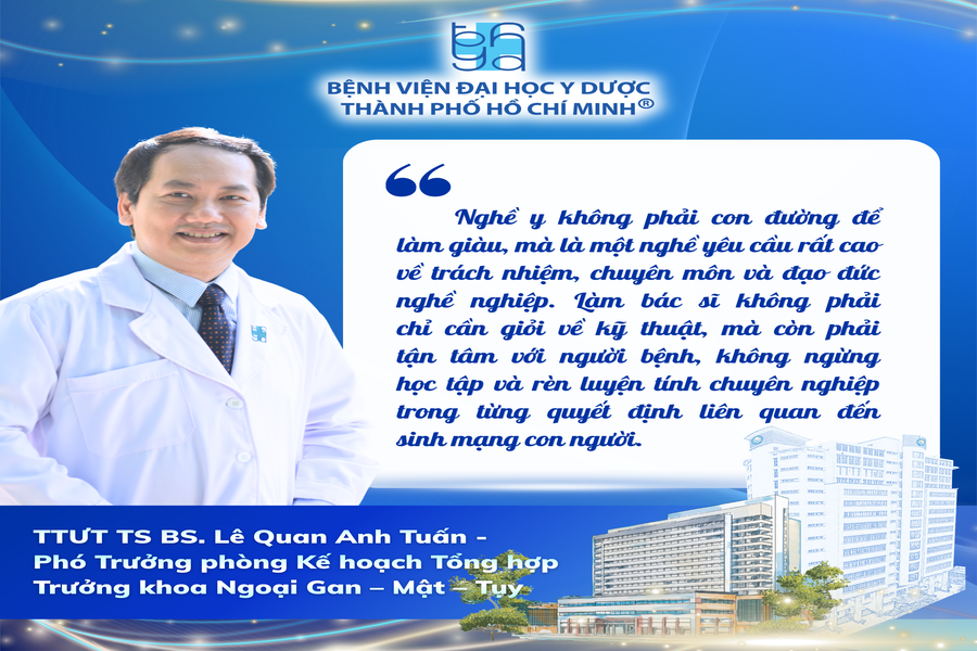 Sau gần ba thập kỷ gắn bó với ngoại khoa, TTƯT TS BS. Lê Quan Anh Tuấn, Phó Trưởng phòng Kế hoạch Tổng hợp, Trưởng khoa Ngoại Gan Mật Tụy, Bệnh viện Đại học Y Dược TP. Hồ Chí Minh, vẫn nhìn nghề y bằng sự điềm tĩnh của một người trong cuộc.