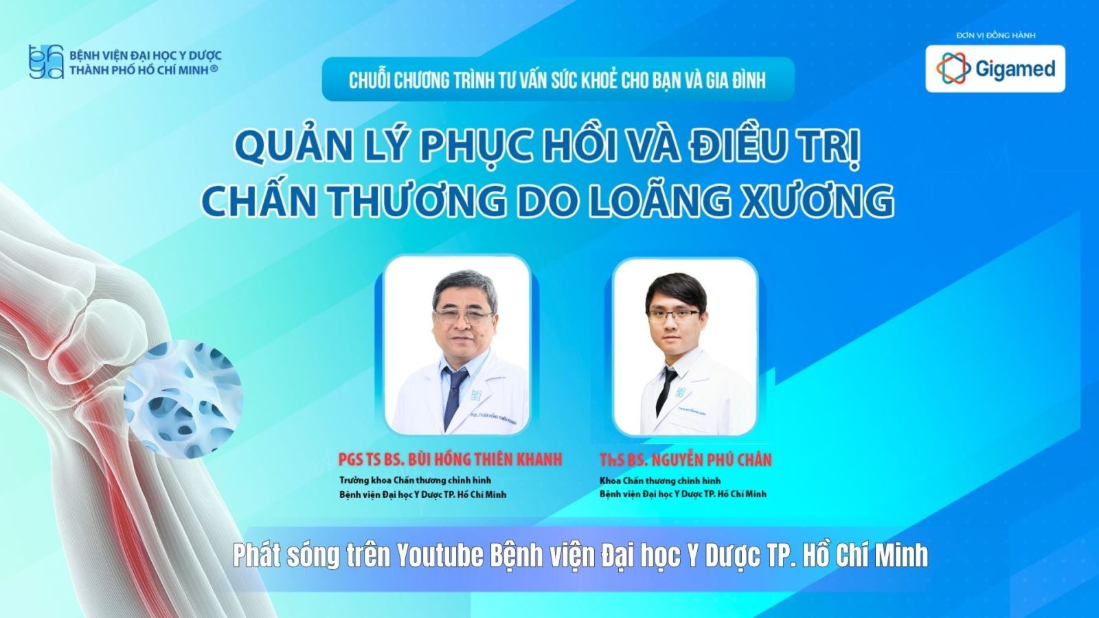 Nhân ngày Loãng xương thế giới, kính mời quý vị xem lại Chương trình tư vấn chủ đề “Quản lý phục hồi và điều trị chấn thương do loãng xương” với sự tư vấn của các chuyên gia PGS TS BS. Bùi Hồng Thiên Khanh - Trưởng Khoa Chấn thương Chỉnh hình Bệnh viện Đại học Y Dược TP. Hồ Chí Minh và ThS BS. Nguyễn Phú Chân - Khoa Chấn thương Chỉnh hình Bệnh viện Đại học Y Dược TP. Hồ Chí Minh
