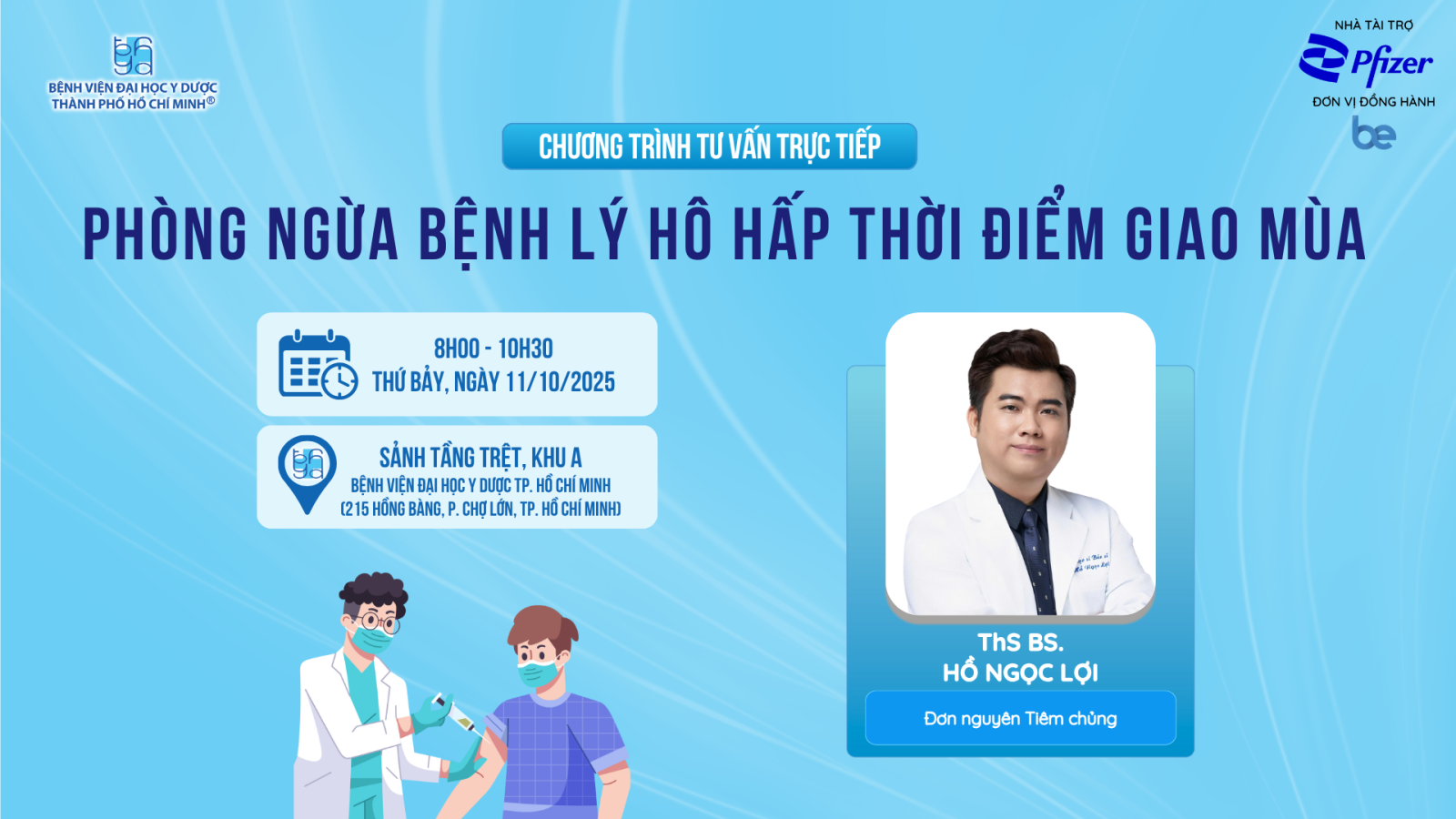 Thời điểm giao mùa là giai đoạn thời tiết và môi trường thay đổi nhanh chóng từ nóng sang lạnh và từ khô sang ẩm đột ngột, khiến hệ miễn dịch của chúng ta dễ bị tổn thương và mắc các bệnh lý hô hấp. Nhằm nâng cao nhận thức cộng đồng về tầm quan trọng của tiêm chủng trong việc chủ động bảo vệ sức khỏe đường hô hấp, Bệnh viện Đại học Y Dược TP. Hồ Chí Minh tổ chức chương trình tư vấn trực tiếp chủ đề “Phòng ngừa bệnh lý hô hấp thời điểm giao mùa”.